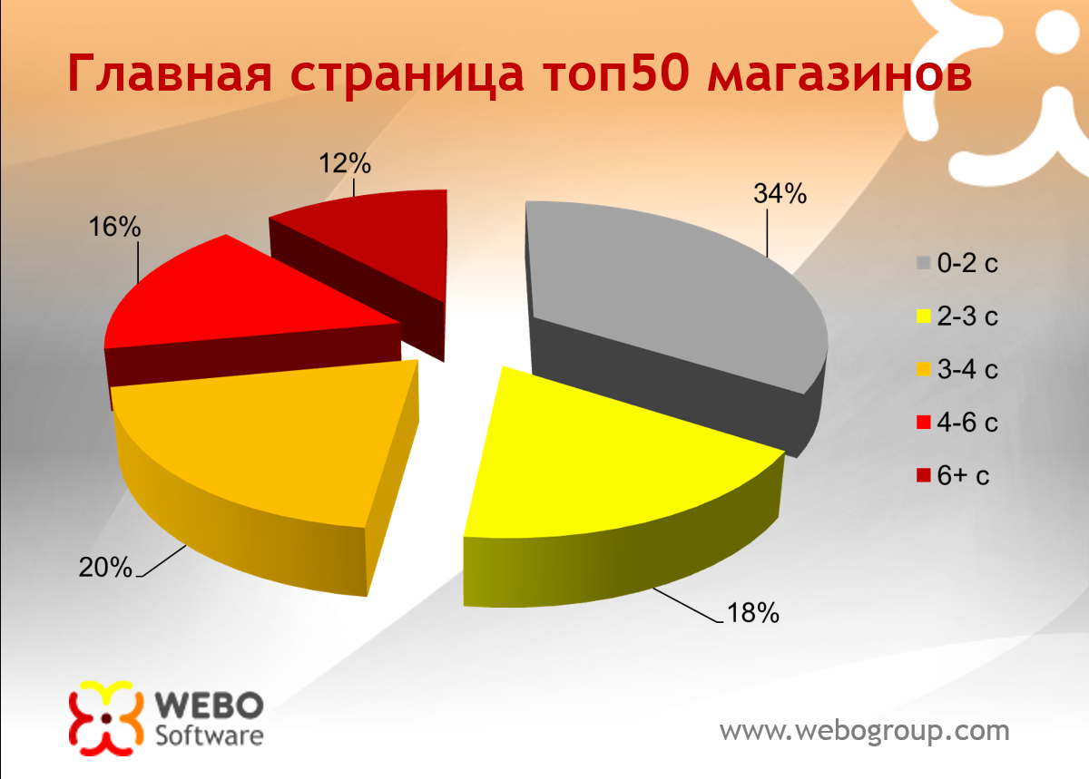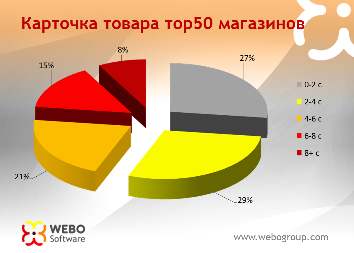 («Коммерсантъ Секрет Фирмы»), из нее выбрано первые 50 сайтов лидеров интернет-коммерции, которые тестировались на скорость. По результатам тестирования получились следующие данные: половина (52%) магазинов открывается за 3 секунды, почти 3/4 (72%) — за 4 секунды. До 6 секунд открываются 88% всех интернет-магазинов из топ-50.